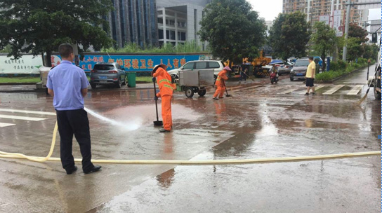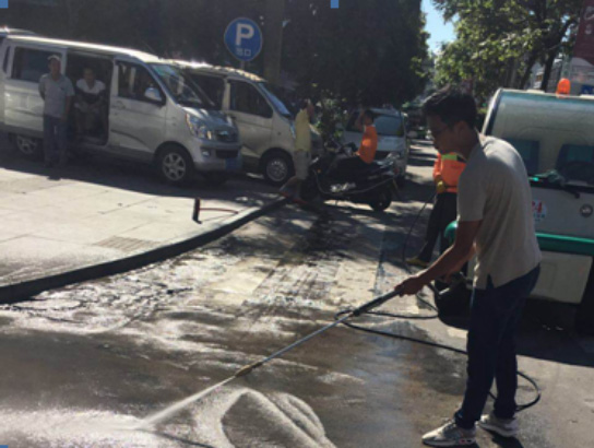▲對(duì)重點(diǎn)交易市場、政府廣場周邊清洗作業(yè)