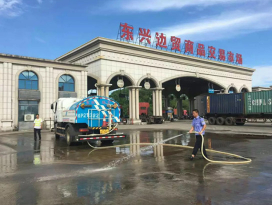 ▲對(duì)國門口岸旅游熱點(diǎn)景點(diǎn)進(jìn)行沖洗作業(yè)