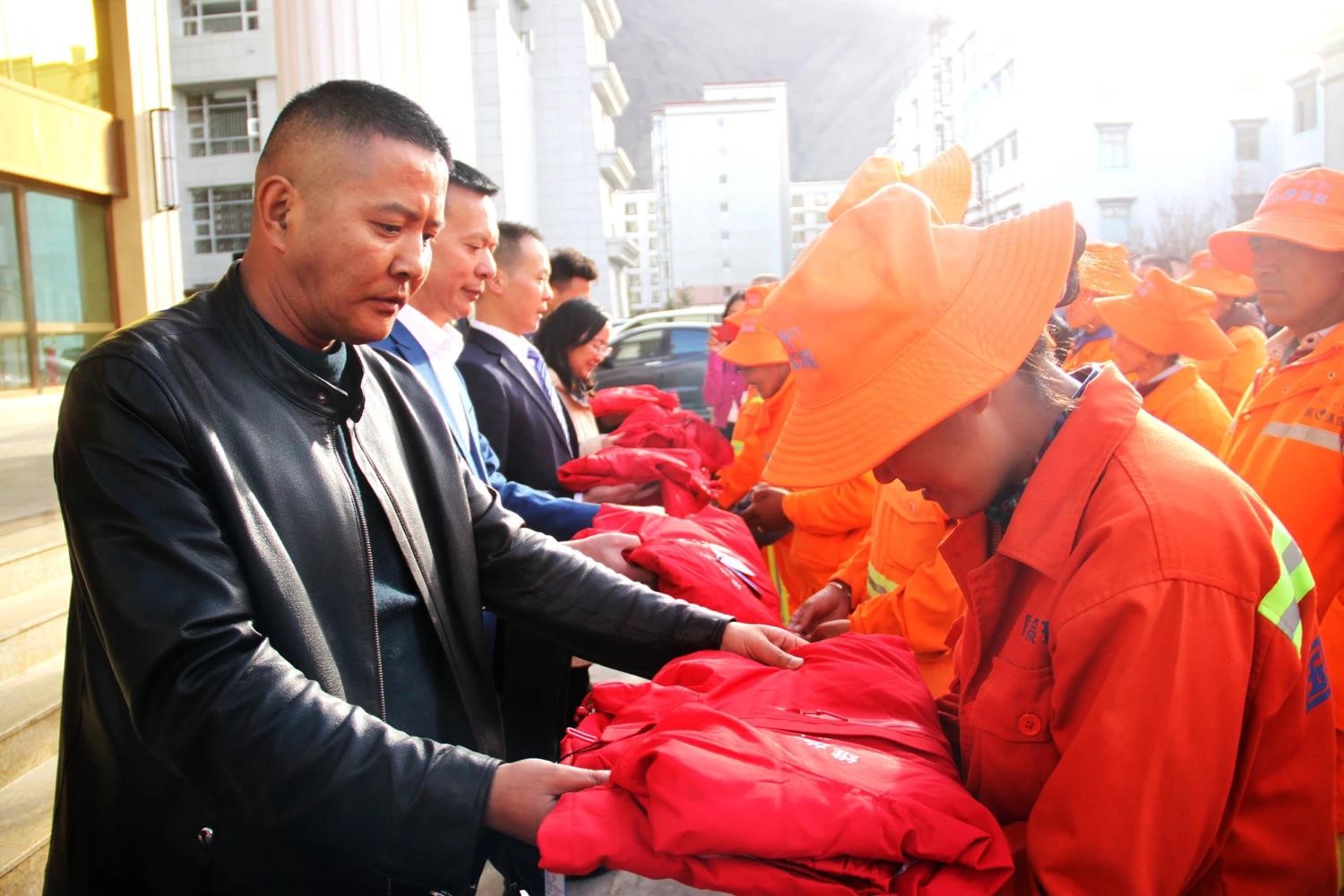 乃東區(qū)副區(qū)長格桑羅布、乃東區(qū)住房和城鄉(xiāng)建設(shè)局局長張俊、國策公司負(fù)責(zé)人次仁旺慶應(yīng)邀參加活動,并共同為環(huán)衛(wèi)工人發(fā)放了保暖御寒的嶄新環(huán)衛(wèi)工裝。