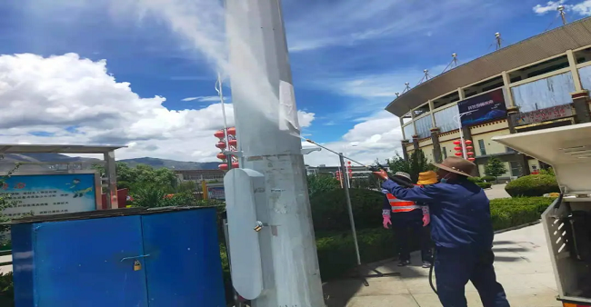 同時(shí),山南分公司還調(diào)配了15名員工、1輛高壓沖洗車、1輛灑水車、1輛洗掃車、1輛多功能沖洗車組成了體育場臨時(shí)清洗隊(duì),對(duì)體育場垃圾桶、電樁小廣告、周邊雜草以及地面等進(jìn)行了集中清理,通過采取高壓水槍沖洗和人工擦拭相結(jié)合的方式,體育場周圍環(huán)境及設(shè)施煥然一新,顯露“本色”。